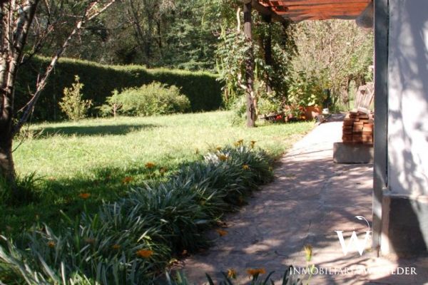 Gran terreno completamente parquizado con cerco perimetral y cerco verde, frutales, flores, senderos .