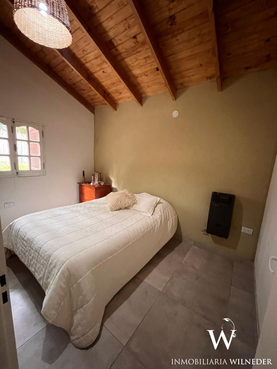 Construcción de material, techo de madera y chapa, aberturas de aluminio, puerta de ingreso de madera, piso pocelanato.